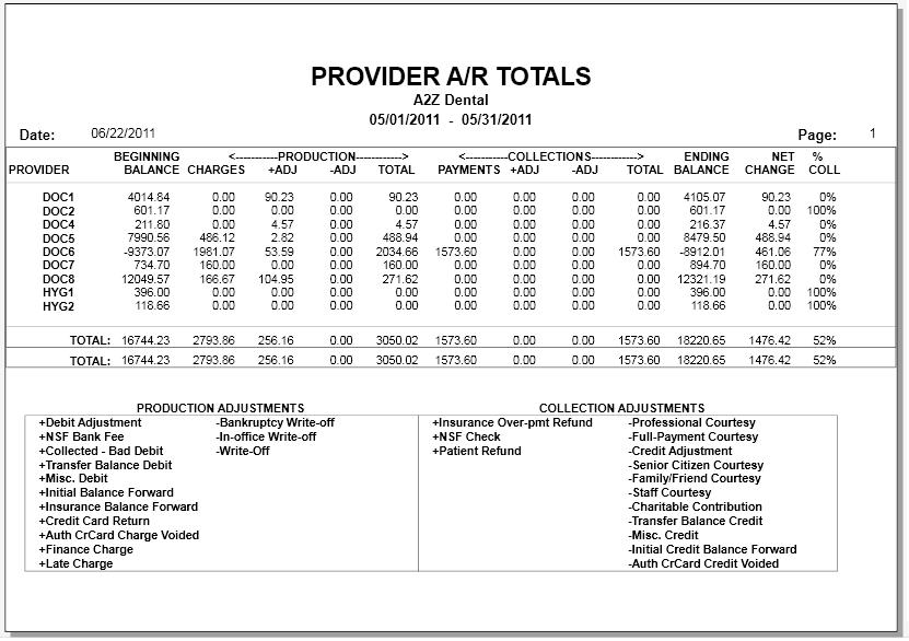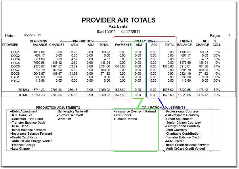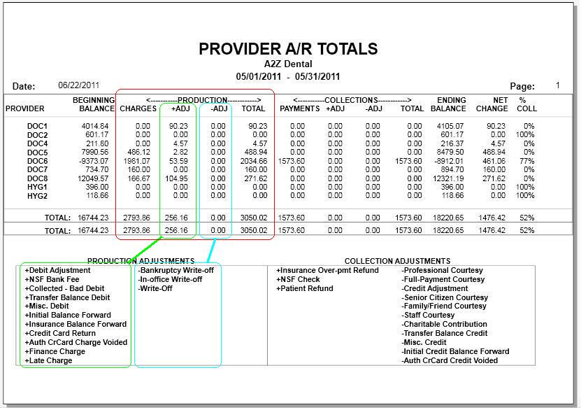 - Adjustments can be arbitrarily assigned to Production Adjustments or Collection Adjustments when running the report. The report will divide these by positive (+) and (-) negative adjustments. Any Finance and Late Charges will be included in these numbers. For this reason, the Total columns can only be compared to the Practice Analysis or any other management report if all (+) Adjustments are assigned to the Production Adjustment List and all (-) Adjustments are assigned to the Collections Adjustment List. This is a workstation specific setting; if the results are different on different computers, check to see if the settings for the report are the same on each computer.