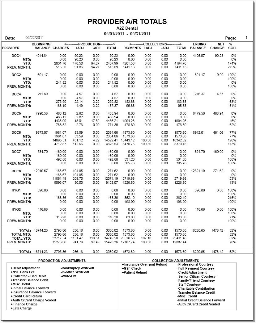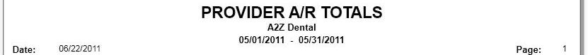 - When comparing the provider totals on the Provider A/R Totals Report with the Aging Report, the Aging Report does not include accounts with a zero balance while the Provider A/R Totals Report does. Therefore, if in the split payment window there are providers with amounts that zero each other out (Ex: DDS1 -50., HYG1 50.) the account would have a zero balance and not show on the Aging Report but would show on the Provider A/R Report.
