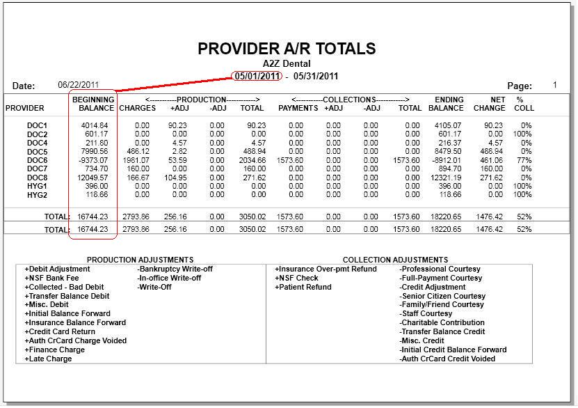 - The Provider A/R Totals Report always calculates the beginning balance by Entry Date even if the report is run by Procedure Date. As a result, when the report is run by Procedure Date, the balances and totals may not match. This may also cause the ending balance of one month to not match the beginning balance of the next month.